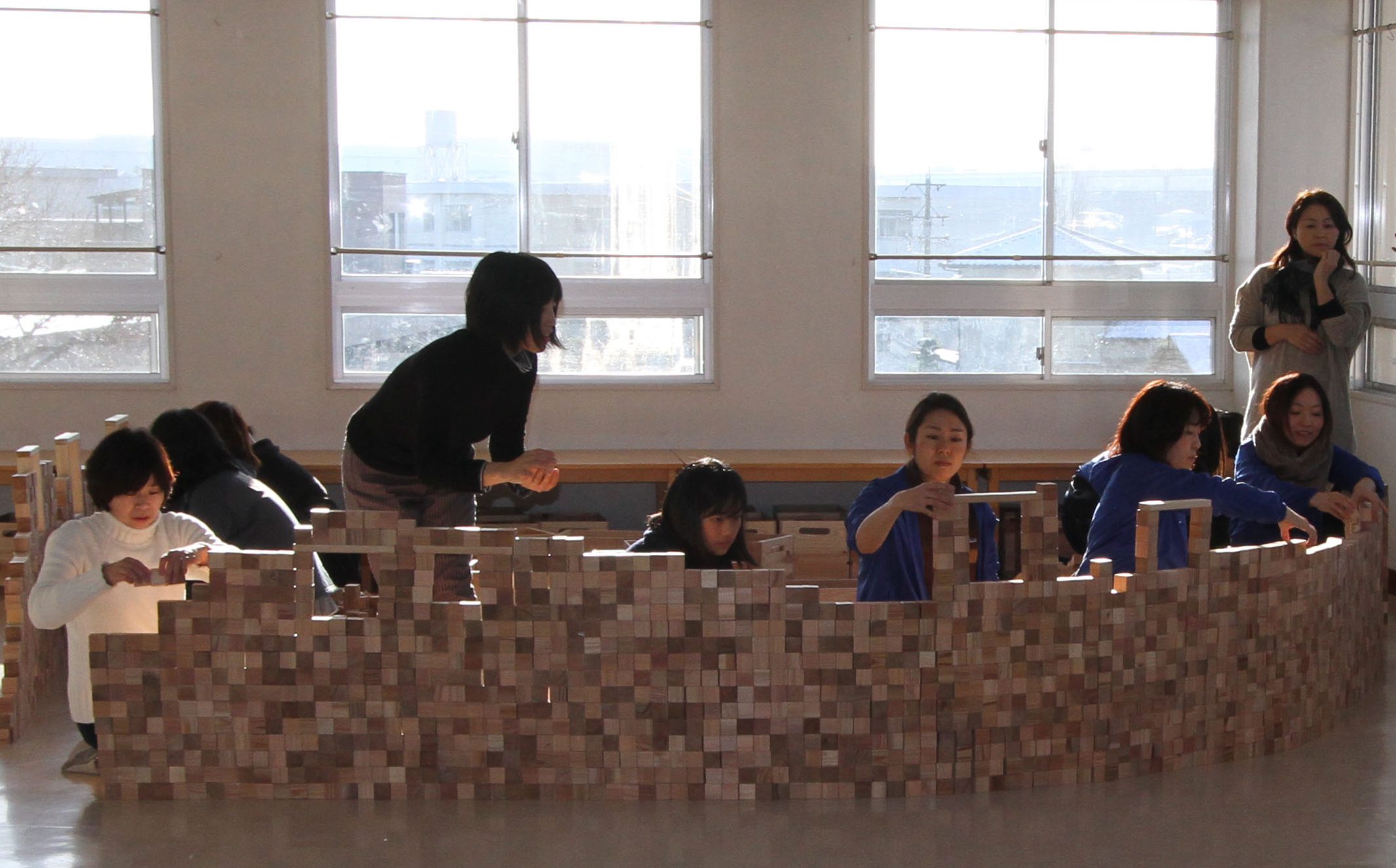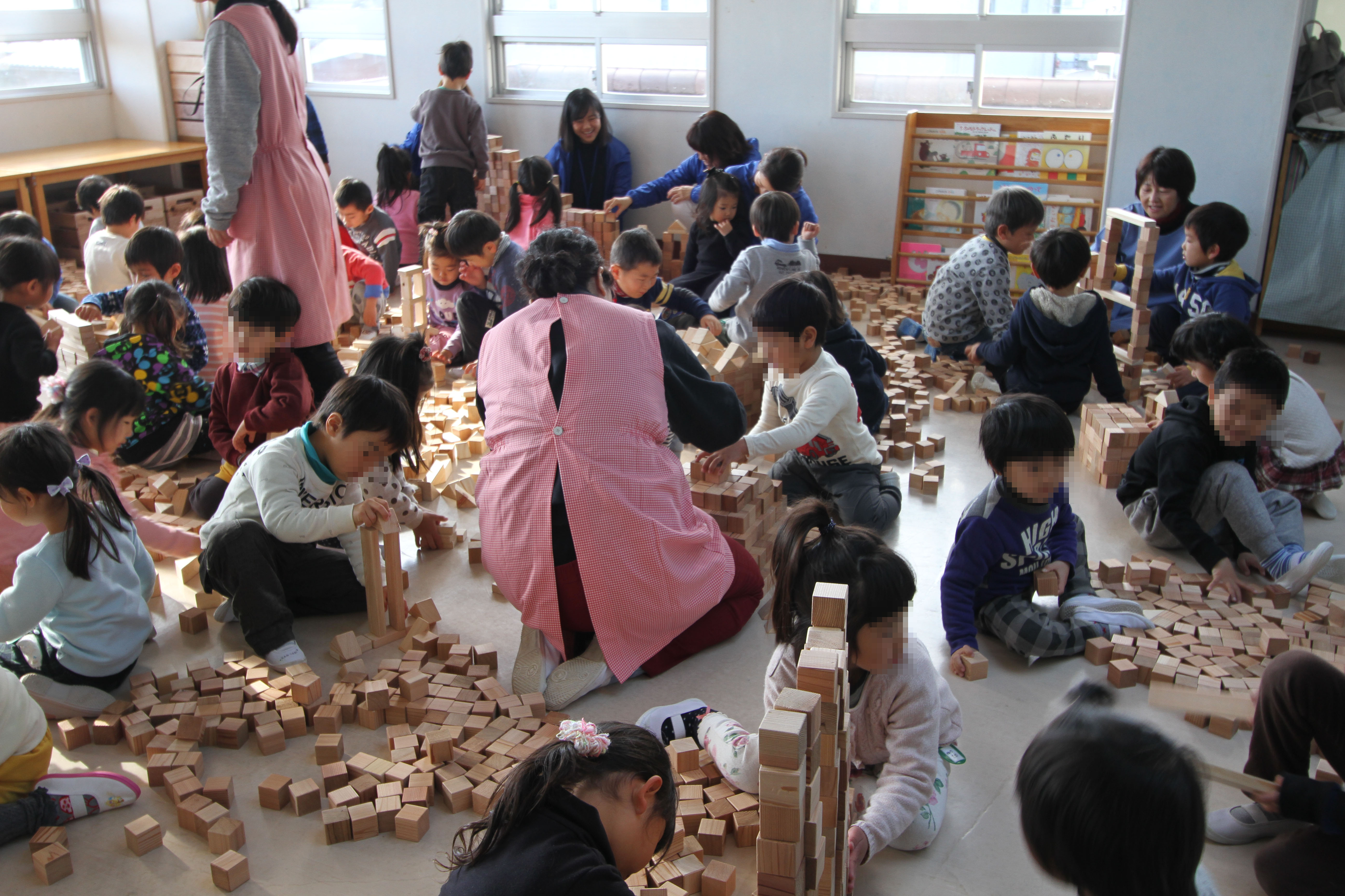 保護者会のお母さんたちは子供たちを驚かせようと、朝からつみきの城壁づくりを楽しんでいました。