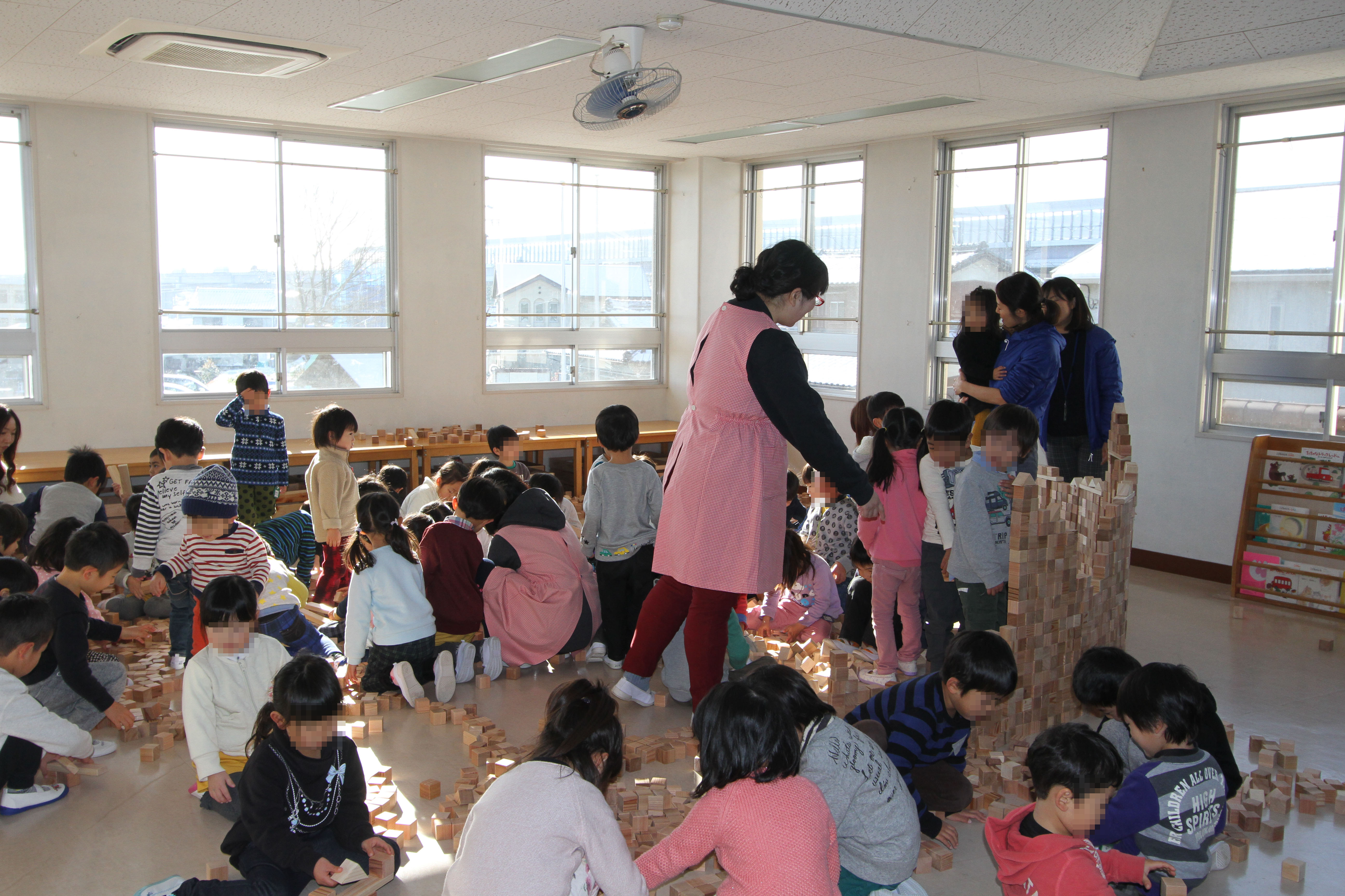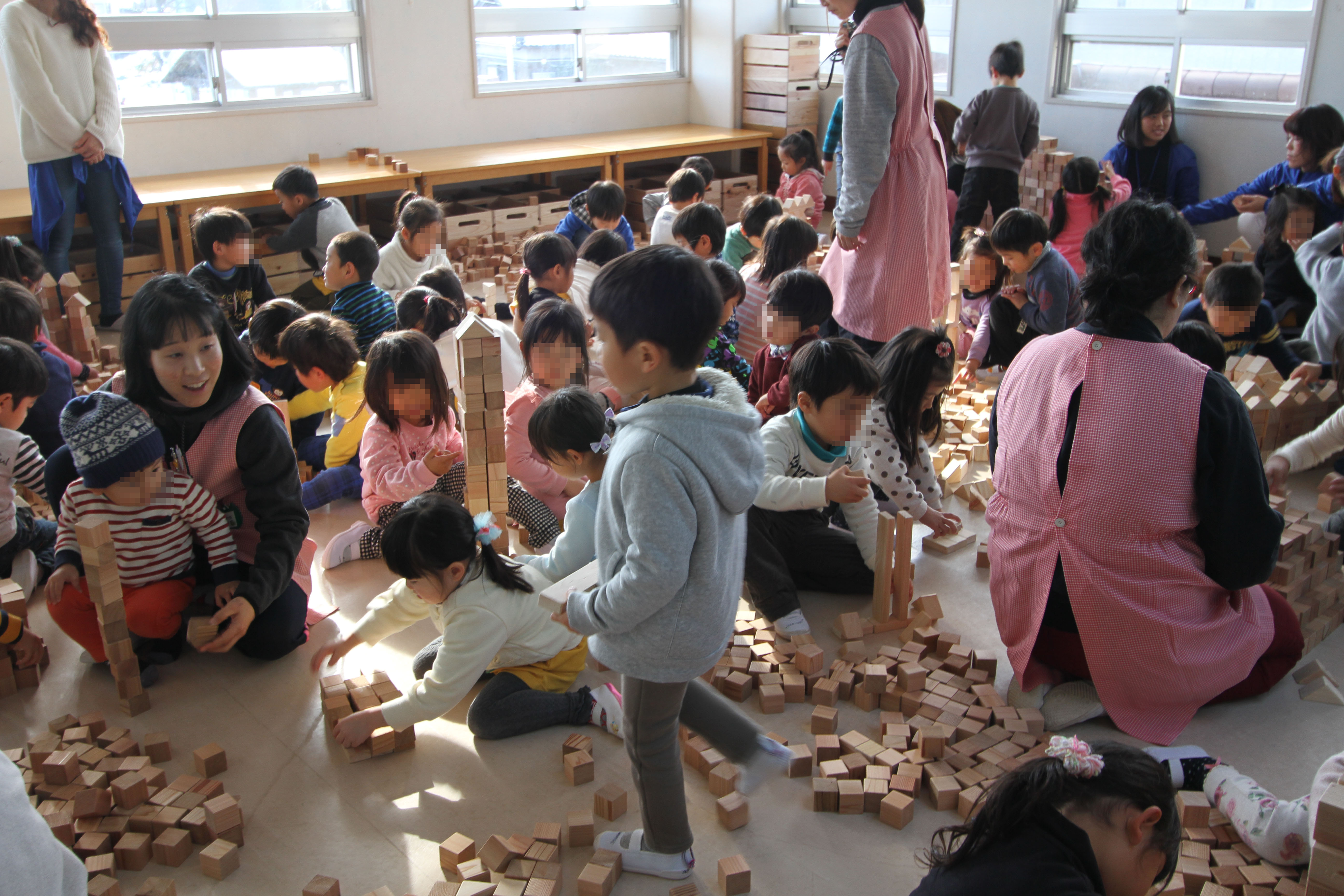 約7000個の立方体、直方体、細長、三角の杉やヒノキのつみきを園児さんたちに遊んでもらいながら、