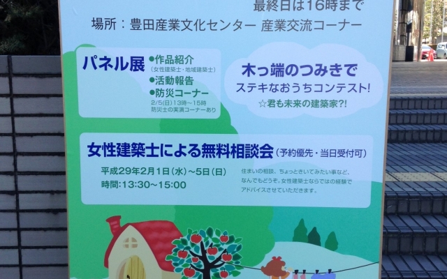 豊田の女性建築士の作品や活動パネルの紹介、防災に関する体験情報コーナー、